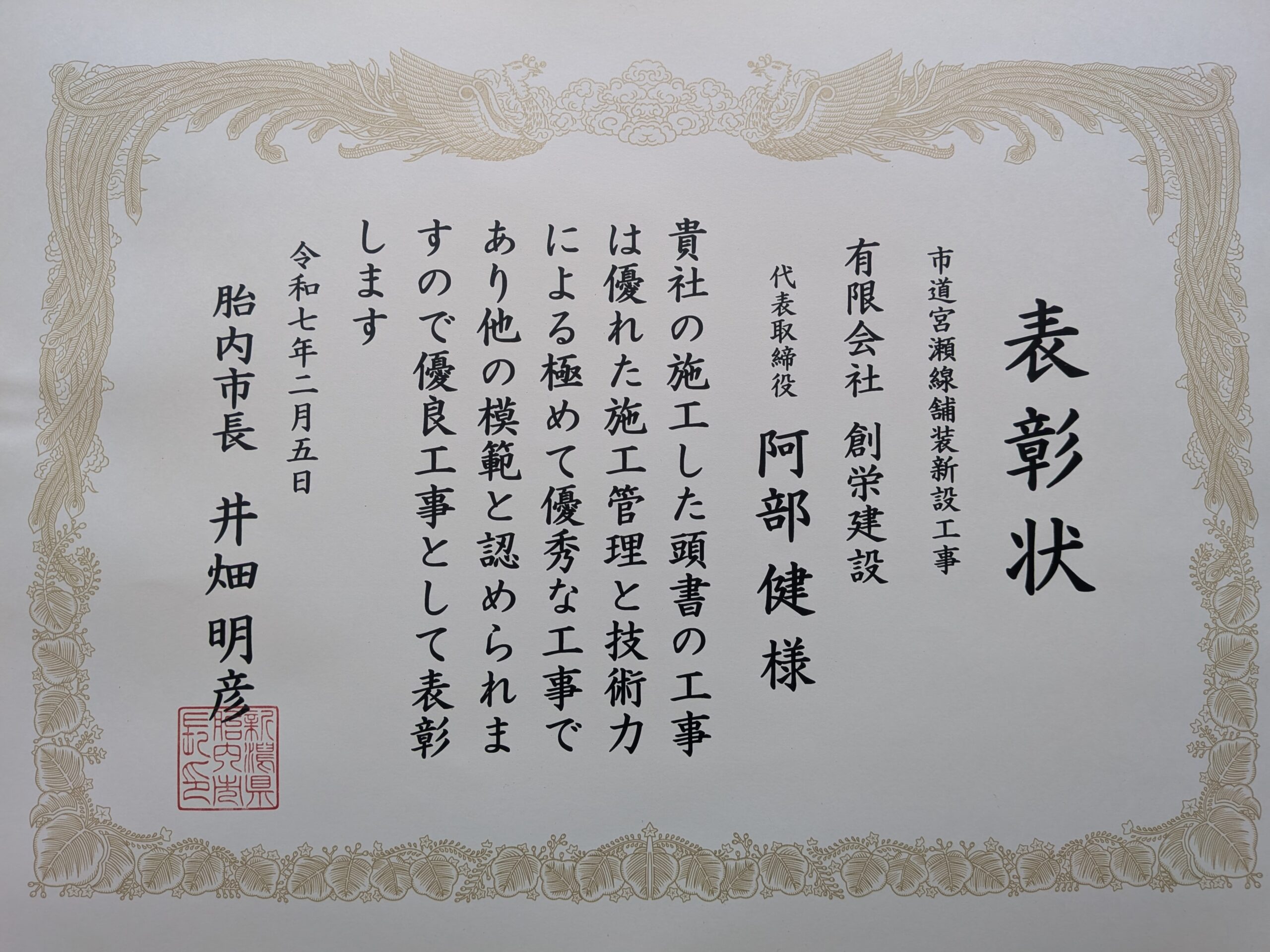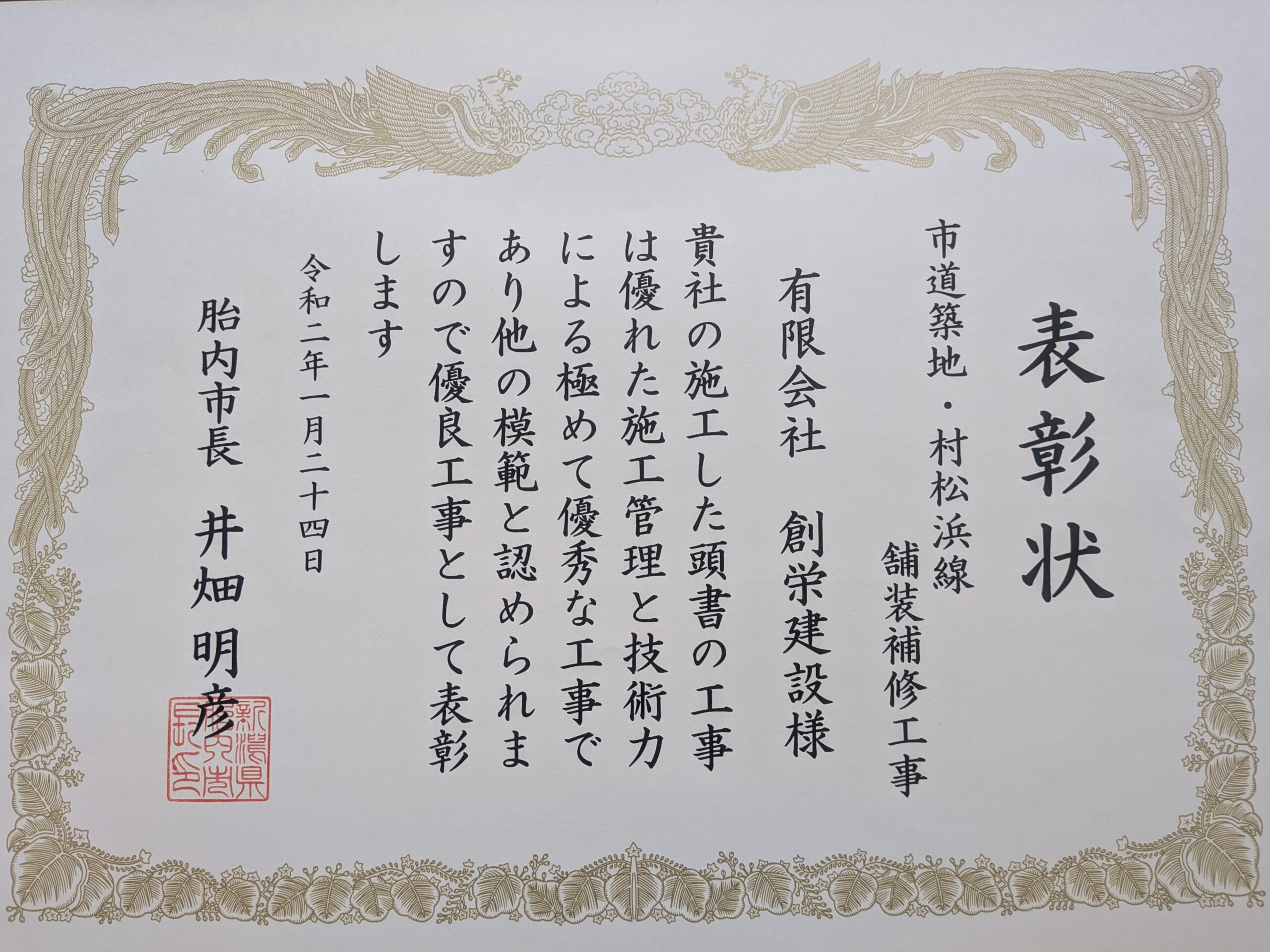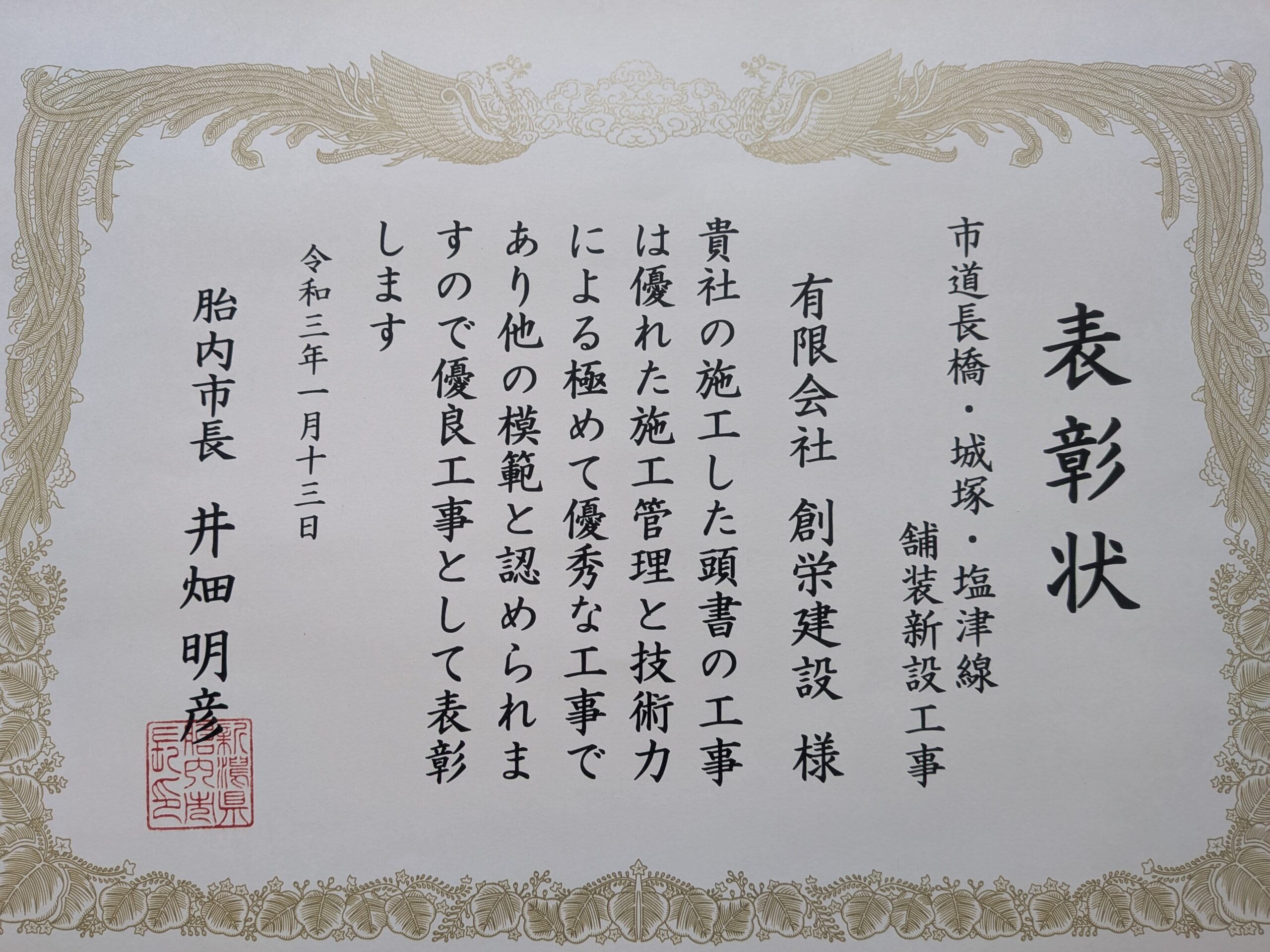 優良工事受賞一覧 ■令和8年2月5日(胎内市) 市道西中央通り線道路改良工事 ■令和7年2月5日(胎内市) 市道宮瀬線舗装新設工事 ■令和5年1月11日(胎内市) 市道鼓岡川原線舗装補修工事 ■令和5年1月11日(胎内市) 市道坪穴錨田2号線舗装補修工事 ■令和3年1月13日(胎内市) 市道長橋・城塚・塩津線舗装新設工事 ■令和2年1月24日(胎内市) 市道築地・村松浜線舗装補修工事