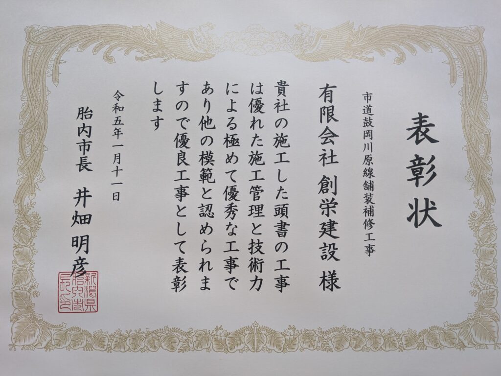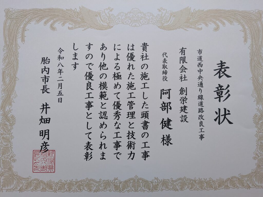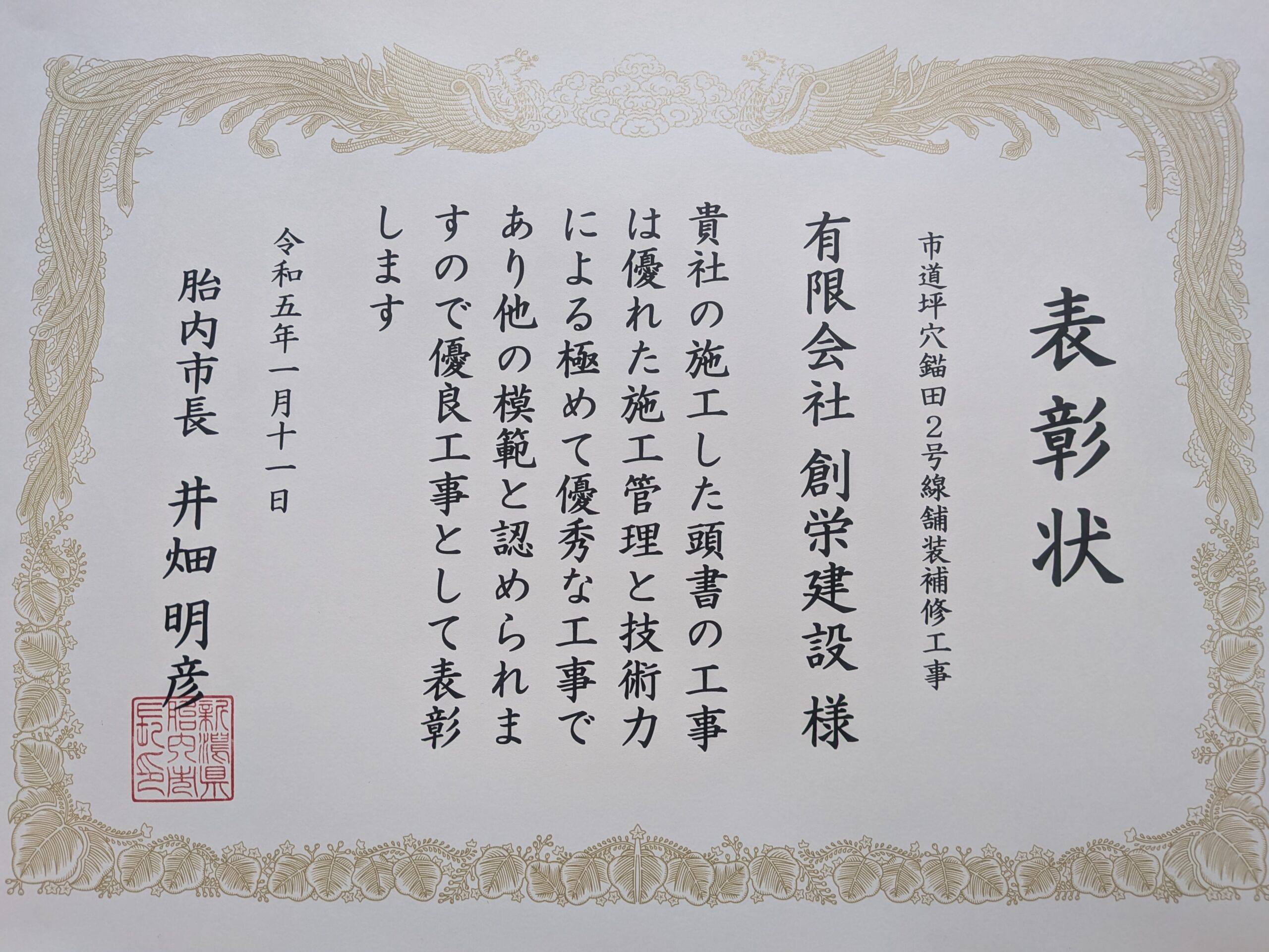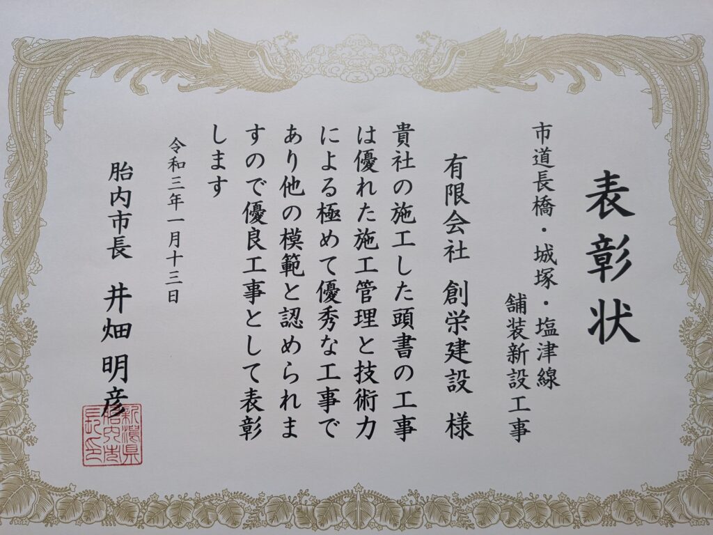 優良工事受賞一覧 ■令和8年2月5日(胎内市) 市道西中央通り線道路改良工事 ■令和7年2月5日(胎内市) 市道宮瀬線舗装新設工事 ■令和5年1月11日(胎内市) 市道鼓岡川原線舗装補修工事 ■令和5年1月11日(胎内市) 市道坪穴錨田2号線舗装補修工事 ■令和3年1月13日(胎内市) 市道長橋・城塚・塩津線舗装新設工事 ■令和2年1月24日(胎内市) 市道築地・村松浜線舗装補修工事